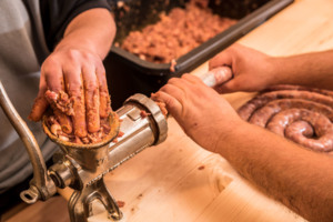 Než budeme plnit klobásy, nachystáme si jemně mleté hovězí maso z krku, přidáme k naloženému vepřovému masu. Hovězího masa nedáváme víc. Mele se najemno aby směs lépe pojila. Odvážíme zbytek koření a přidáme ke směsi. Kmín dáváme až v závěrečné fázi, aby maso nekvasilo.