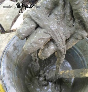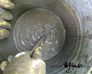 Do betonu namáčejte připravené kusy látek. Pracujte v rukavicích, pořádně promačkávejte. Beton se musí dostat do každého místečka.