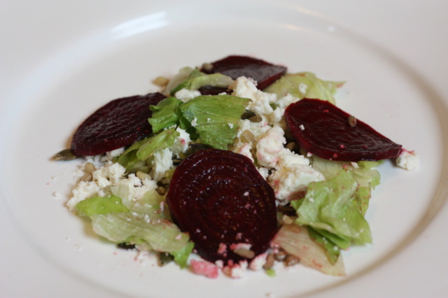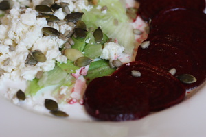 Servírujeme spolu s tence nakrájenými plátky pomeranče, posypané kostkami balkánského sýra a opraženými semínky.