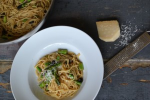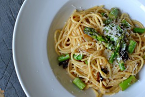 Mezitím, co si na pánvi hrajeme s chřestem a rajčaty, uvaříme v osolené vodě špagety doměkka. Scedíme je a necháme si stranou asi hrnek vody, ve které se vařily.