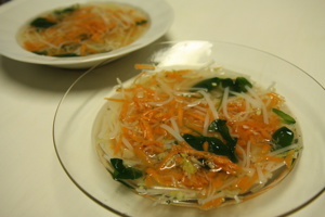 Zeleninu očistíme. Mrkev nastrouháme na hrubém struhadle, petržel na jemném struhadle. Cibulku a řapíkatý celer nakrájíme na malé kousky. Nudle nalámeme.