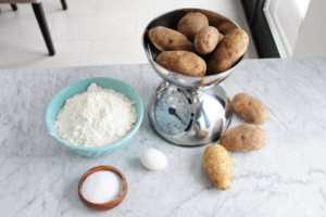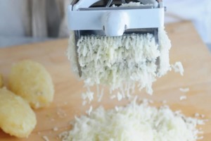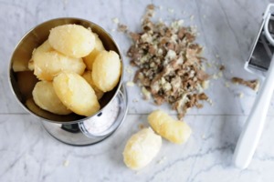 Brambory uvařte ve slupce, v osolené vodě. Horké oloupejte a nastrouhejte na jemném struhadle nebo propasírujte lisem na brambory.