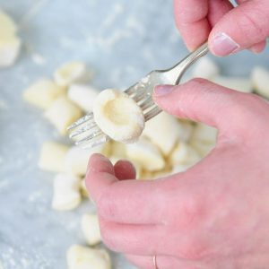 Do pyré přidejte žloutek, mouku, sůl a muškátový oříšek. Vytvořte těsto, ze kterého na pomoučeném vále vytvarujte dlouhé válečky. Mě se dobře pracovalo tak, že jsem si těsto rozdělila na osm stejných dílů a válela postupně osm válečků. Každý váleček nakrájejte na kousky. Výsledný nok by měl mít zhruba 3 x 2 cm. Ale záleží, jak se vám budou líbit :-)