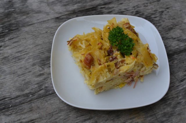 Směs vsypeme do pekáče vymazaného máslem. A pečeme v troubě vyhřáté na 190 °C, asi 20-30 minut.