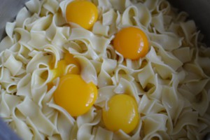 Do lehce prochladlých těstovin vyklepneme vaječné žloutky. Bílky necháme stranou.