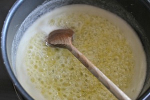 Maličko ztlumíme teplotu a vsypeme do hrnce mouku. Ihned rozmícháme metličkou, aby nevznikly hrudky.