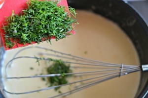 Ihned přidáme také nadrobno nasekaný kopr. Používáme jen jemné části kopru, ne tvrdé stonky.