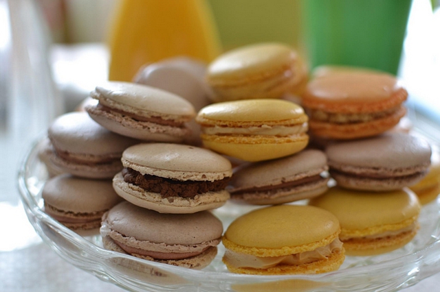Recepty na krémy se hodí nejen do oblíbených francouzských makronek. Žluté makronky skrývají luxusní náplň ze slaného karamelu. Oranžové v sobě mají jemnou ganache z bílé čokolády a kávy.