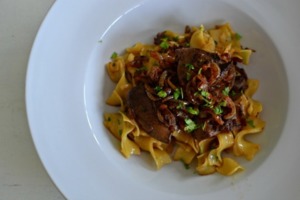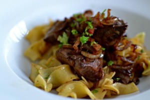 Z pánve vyndáme játra i cibuli a do výpeku vsypeme uvařené a scezené těstoviny. Můžeme přidat ještě půl hrnku vody, ve které se těstoviny vařily. Těstoviny tak nebudou suché. Ještě je chvíli na pánvi opékáme a vsypeme rovnou na talíř.