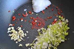 Najemno nasekanou cibuli, chilli papričku a česnek na omáčku dejte do pánve. Přidejte kokosový olej. Osmahněte.
