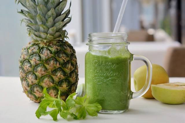 čerstvý ananas, banán, řapíkatý celer, zelené jablko, špenátové listy, citron, voda/led + superpotraviny: kapusta, mladý ječmen