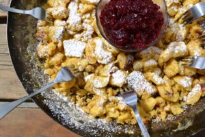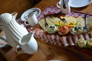 Snídaně byla dokonalá. Domácí uzeniny – špek, pečené maso, šunka, domácí sýr, zelenina, pomazánky, domácí džemy, med, chléb pečený v kamenné peci. Jako zlatý hřeb byl úžasný trhanec s hrozinkami a domácím džemem z červeného rybízu. Když si budete chtít pochutnat v Alpách na trhanci, dívejte se po názvu Kaiserschmarrn.