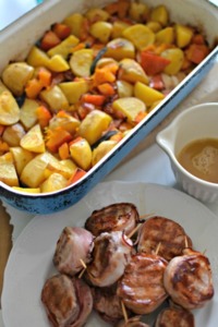 Jako přílohu k vepřovými medailonkům jsme zvolili brambory pečené s dýní a šalvějí. Výhodou této přílohy je, že se hodí k různým masům a peče se v troubě vlastně sama. Takže jedinou práci, kterou s ní máte, je nakrájet suroviny a nasypat je do pekáče. Potom máte čas připravit si medailonky a všechny je pěkně opéct na pánvi.