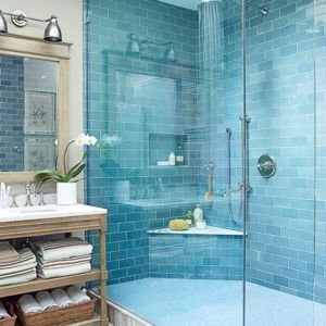 Před spaním prochází každý z nás koupelnou. I té svědčí modrá barva. Je přeci taková mořská. Nebo nebeská. Ať tak či tak, je nádherná.