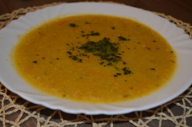 Přilijeme cca litr a půl vody, 10 minut povaříme a vše tyčovým mixerem dohladka rozmixujeme. Přidáme dvě na kostičky nakrájené mrkve a třikrát předem propláchnuté jáhly a 15 minut vaříme.