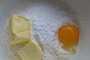 Připravte si suroviny na košíčky. Hera musí být vychlazená. Co nejrychleji uhněťte nelepivé těsto. Rychle pracujete proto, aby se těsto moc nezahřálo. Ideální je pro tuto práci kuchyňský robot. Hotové těsto zabalte do potravinářské folie a dejte na hodinu až dvě odpočinout do lednice.