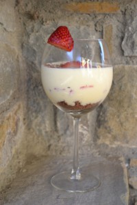 K bílé čokoládě krásně ladí jahody. Na dno skleničky jsem nadrobila trochu čokoládového piškotu, který mi zbyl, když jsem vykrajovala kolečka pro Míša dezert. Nemusíte dávat nic nebo nadrobit třeba oblíbenou sušenku. Třeba karamelové Lotus jsou pro tento účel jako dělané.