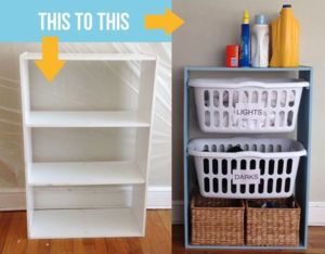 Jak u vás doma třídíte špinavé prádlo? Máte oddělené koše nebo všechno házíte na jednu hromadu a třídíte než vložíte do pračky? Každý nemá velký prostor, kde by umístil několik košů na různobarevné druhy oblečení. My jsme pro vás našli super nápad jak ze staré knihovny (skvěle se hodí třeba Billy z Ikea) vyrobit polici na koše se špinavým prádlem.