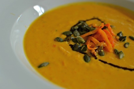 Na talíři polévku ozdobte upraženými dýňovými semínky, mrkví opékanou na másle a dýňovým olejem.
