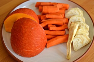 Všechnu kořenou zeleninu oloupejte. Dýni rozkrojte, zbavte tuhých konců a vykrojte dužinu se semínky.