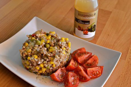 Pro tento recept potřebujete uvařené pšeničné kroupy a pohanku. Nic jiného vařit nepotřebujete. Přidáte jednoduše zeleninovou směs z konzervy.