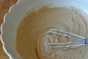 Mouku, prášek do pečiva, skořici, muškátový oříšek a sůl smícháme dohromady a důkladně promícháme. Máslo rozpustíme a vyšleháme s podmáslím. Nelekejte se, směs se může začít trochu „cuckovat“, ale půjde to rozšlehat a navíc, nemusí být úplně hladká. Všechno se upraví vmícháním suché směsi.