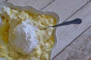 Tvarohy dejte do misky a vyklepněte k nim vejce, přisypejte cukr. Množství cukru uvedené v receptu můžete upravit podle své vlastní chuti, protože někdo má raději sladké dezerty, jiný méně sladké.