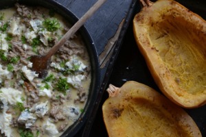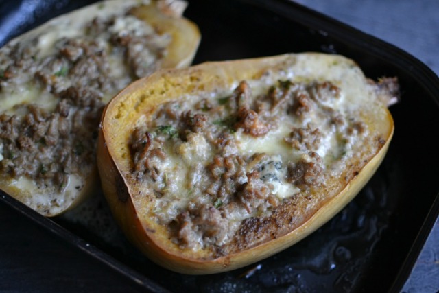 Směs naplňte do upečené špagetové dýně. Nakonec zasypejte strouhaným parmezánem.