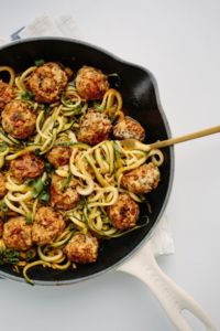 Ve velké pánvi smíchejte ingredience an omáčku. Přiveďte k varu, potom ztlumte a vařte minutu. Po této době se suroviny propojí a omáčka pěkně zhoustne. Přidejte upečené masové koule do pánve k omáčce a jemně promíchejte, aby se obalily omáčkou. Vyndejte koule z pánve a dejte do ní cuketové nudle. Vařte dokud nebudou al dente, to je zhruba pět minut. Pozor, ať je nerozvaříte!