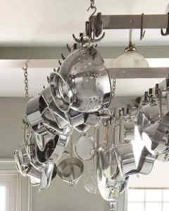 Nevyužitý prostor u stropu? Zavěste na něj police s háčky. Uložíte zde pánve, hrnce, naběračky, cedníky. Jen je potřeba často otírat prach.