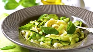 Do hrnce dejte vařit vodu a připravte si veškeré suroviny. Cibuli oloupejte a nasekejte nadrobno. Ve hmoždíři rozdrťte česnek, bazalku a špetku hrubozrnné soli a pastu smíchejte se 3 lžícemi olivového oleje. A nejdůležitější ingredienci, důkladně omytou cuketu, nakrájejte na tenké proužky – nejlepším pomocníkem v tomto případě bude škrabka, s níž dosáhnete ideální tloušťky.