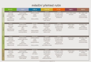 Jak vidíte, každý den přináší úkoly v jiné místnosti nebo oblasti a tyto úkoly se během měsíce s různou frekvencí opakují. O víkendu je povinností daleko méně, ctí se rodinný program a odpočinek (ano, už žádné rodinné šůrovací soboty v podobě, jak si je pamatujeme z dětství!).